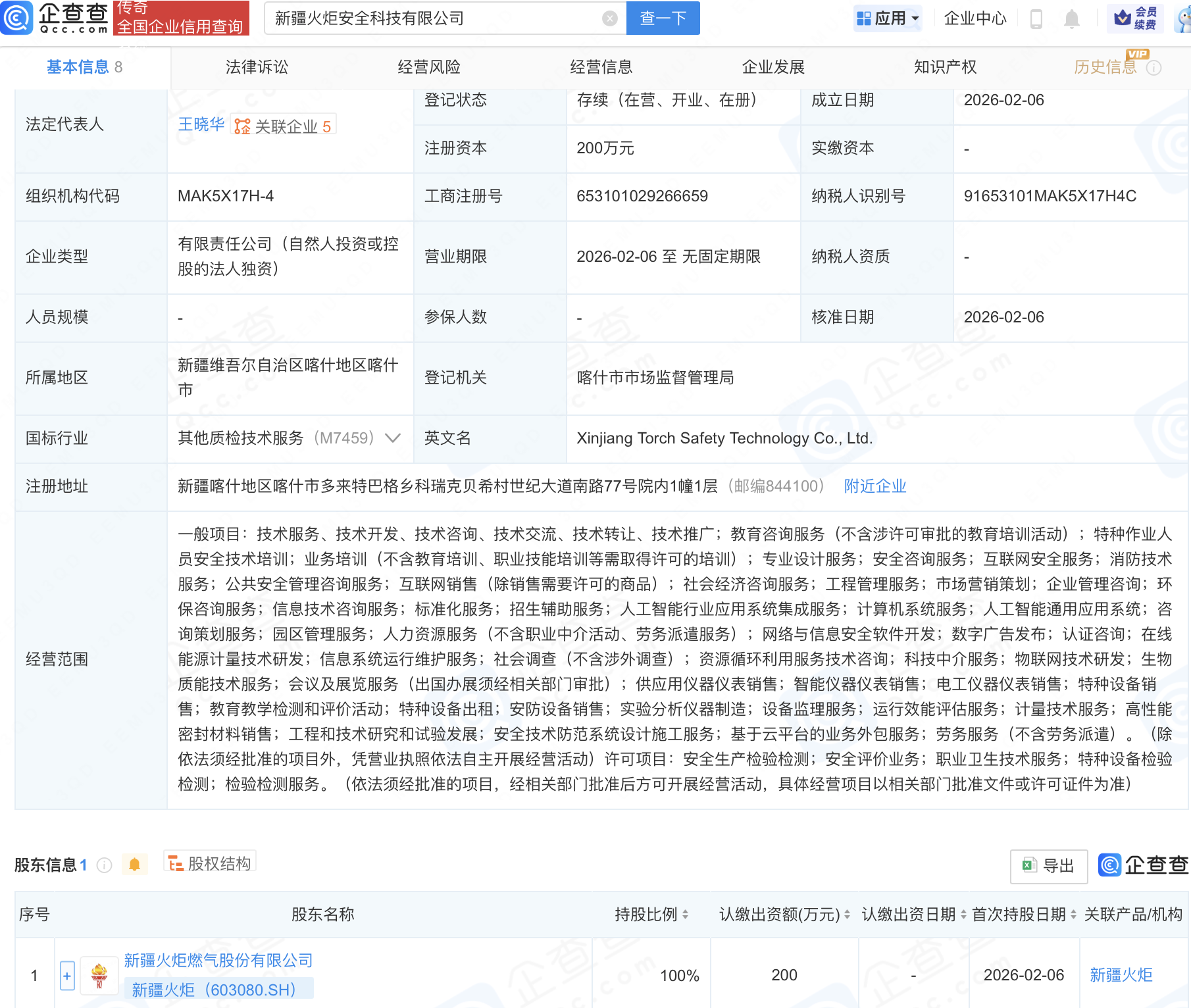 近日,新疆火炬安全科技有限公司成立,经营范围包含:人工智能行业应用系统集成服务;计算机系统服务;人工智能通用应用系统;咨询策划服务;园区管理服务等。企查查股权穿透显示,该公司由新疆火炬(603080)全资持股。